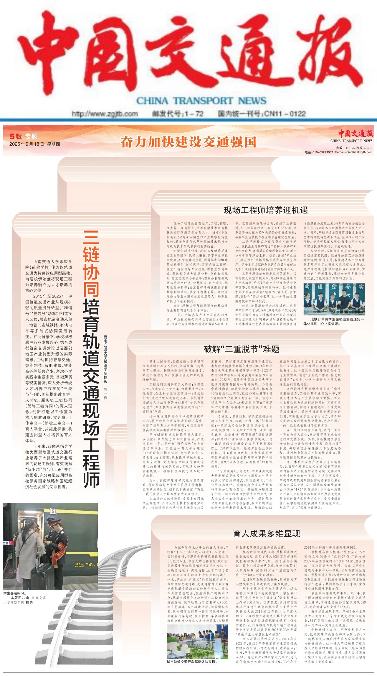 《中国交通报》由交通运输部主管、中国交通报社主办,是全国交通运输行业新闻宣传和舆论引导的主渠道、主阵地、主力军,是我国交通宣传工作的开创者、奠基者、引领者,在全国交通宣传战线具有强大的号召力、组织力、影响力。西南交通大学希望学院作为一所以轨道交通为特色的全日制工科类普通本科高等院校,近年来围绕教育强国建设、四川省教育“三区一高地”建设,以学生为中心,以育人为根本,以提质为核心,实施党建示范创建工程、立德树人工程、转设转型工程、教育教学综合改革工程、办学保障提升工程等“五大工程”,做优轨道交通特色,做强数智化转型,取得了显著的成绩,也得到行业媒体的高度关注。