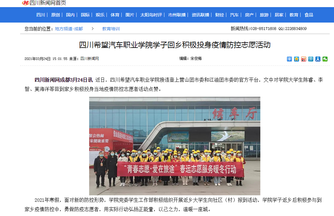 四川新闻网 | 四川希望汽车职业学院学子回乡积极投身疫情防控志愿活动