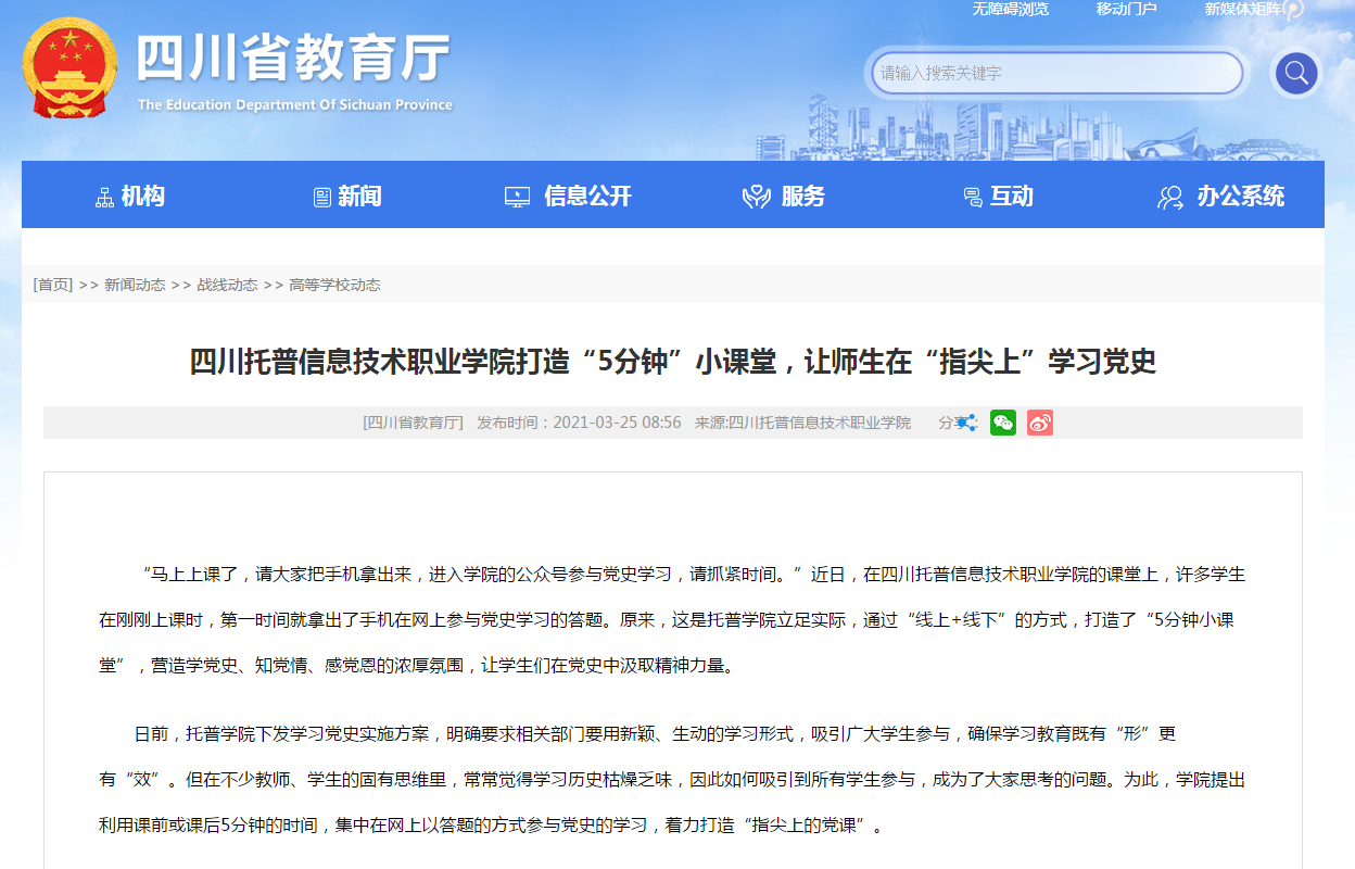 四川省教育厅|四川托普信息技术职业学院打造“5分钟”小课堂,让师生在“指尖上”学习党史
