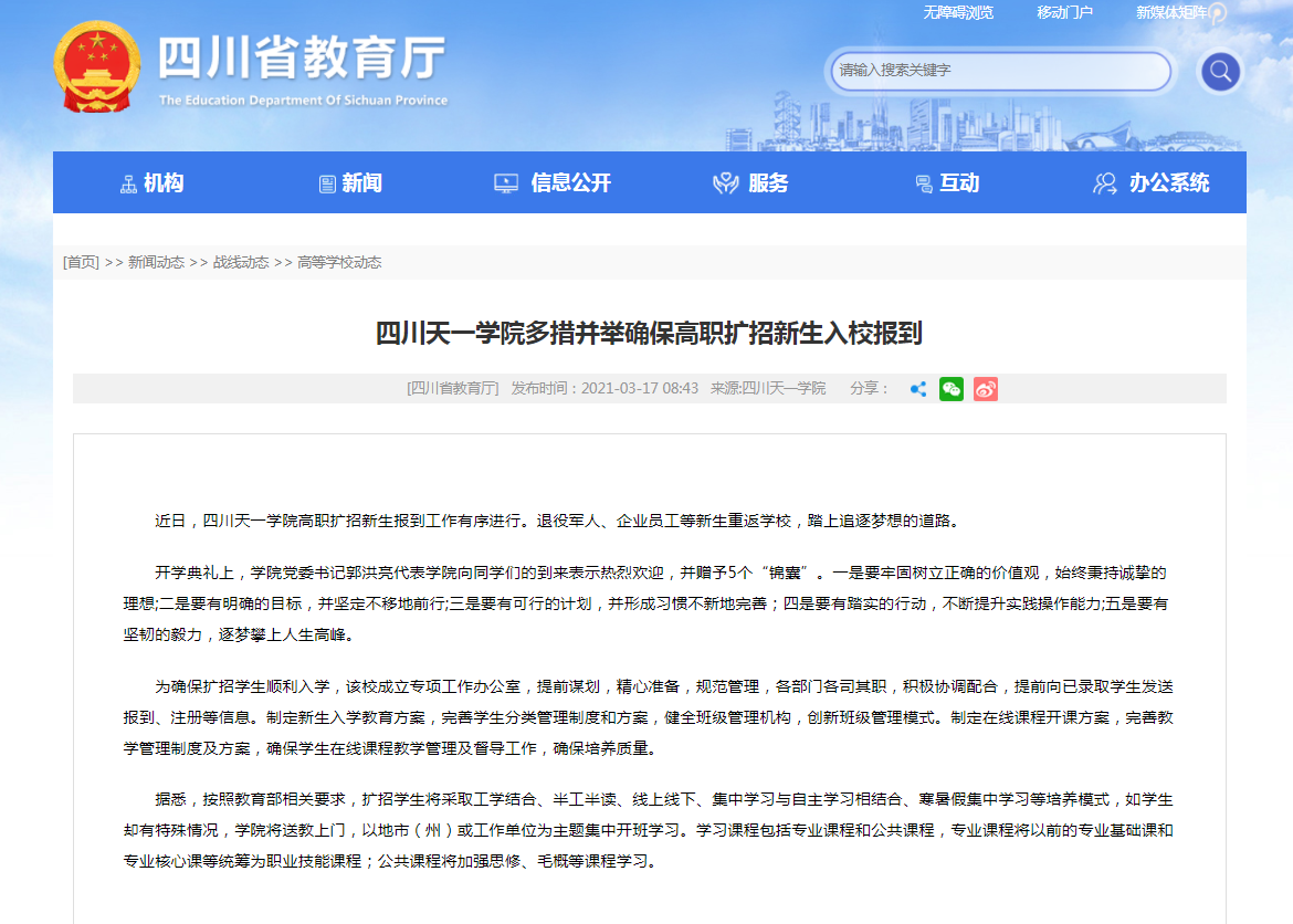 四川省教育厅 | 四川天一学院多措并举确保高职扩招新生入校报到