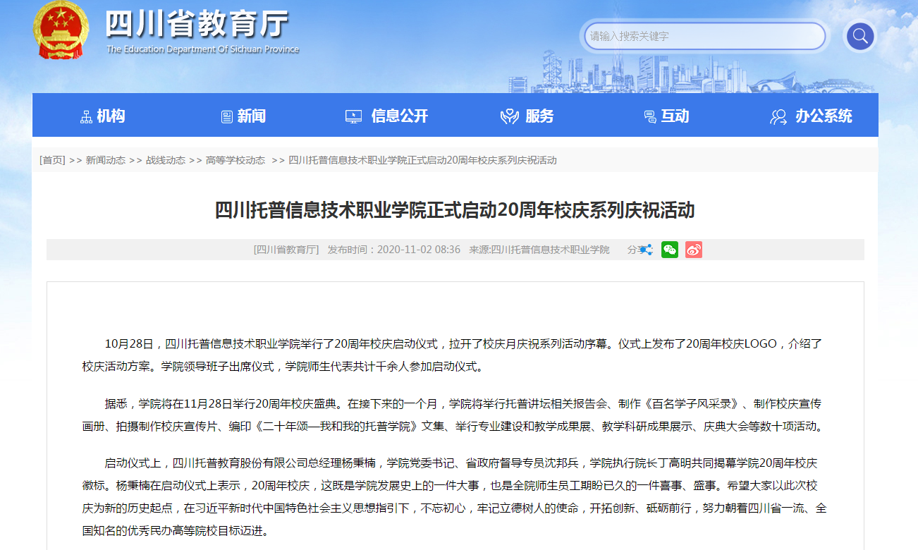 四川省教育厅 | 四川托普信息技术职业学院正式启动20周年校庆系列庆祝活动