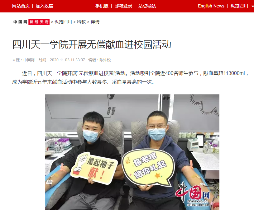 中国网锦绣天府 | 四川天一学院开展无偿献血进校园活动