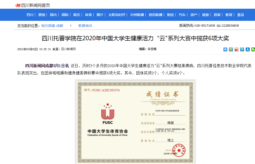 四川新闻网 | 四川托普学院在2020年中国大学生健康活力“云"系列大赛中揽获6项大奖