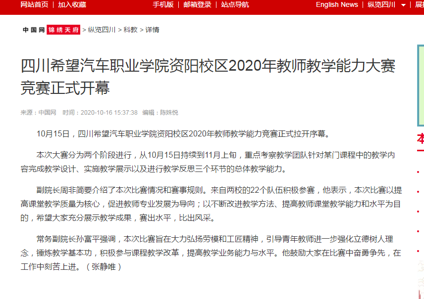 中国网锦绣天府 | 四川希望汽车职业学院资阳校区2020年教师教学能力大赛竞赛正式开幕