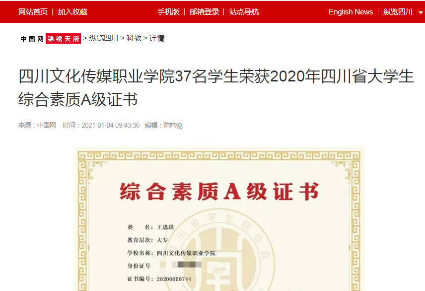 中国网锦绣天府 | 四川文化传媒职业学院37名学生荣获2020年四川省大学生综合素质A级证书