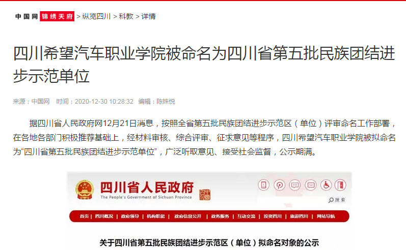 中国网锦绣天府 | 四川希望汽车职业学院被命名为四川省第五批民族团结进步示范单位