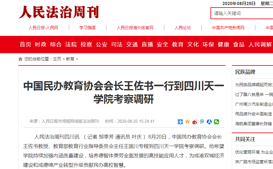人民日报法治周刊 | 中国民办教育协会会长王佐书一行到四川天一学院考察调研