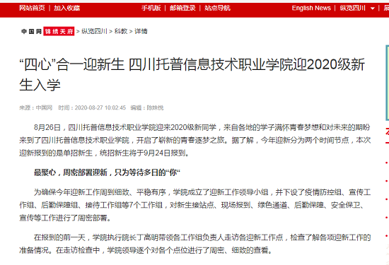 中国网锦绣天府 | “四心”合一迎新生 四川托普信息技术职业学院迎2020级新生入学