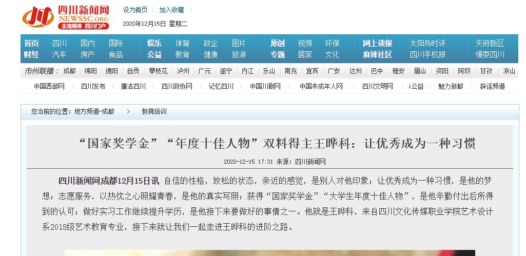 四川新闻网 | 四川文化传媒职业学院“国家奖学金”“年度十佳人物”双料得主王晔科:让优秀成为一种习惯