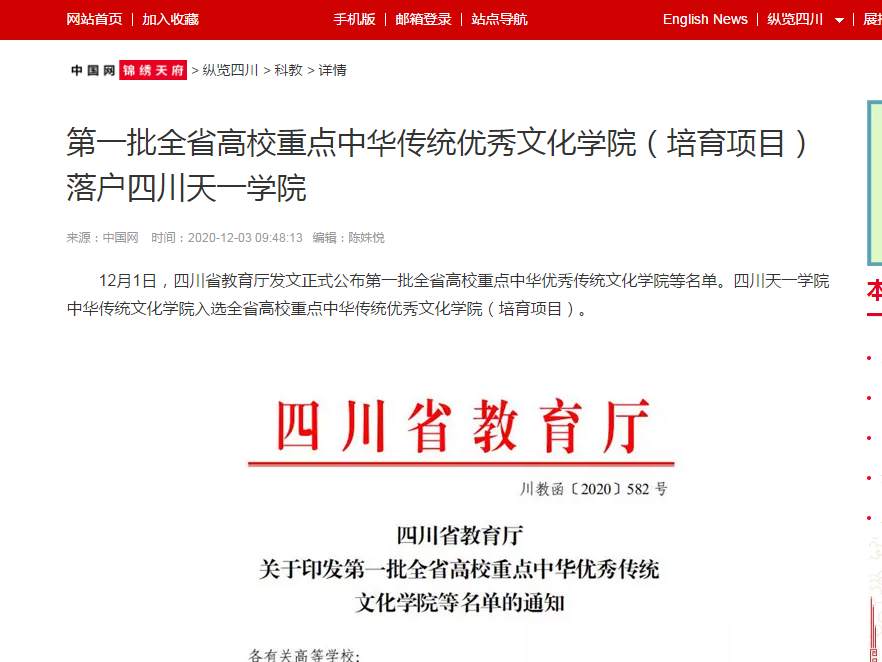 中国网锦绣天府 | 四川省第一批全省高校重点中华传统优秀文化学院(培育项目)落户四川天一学院