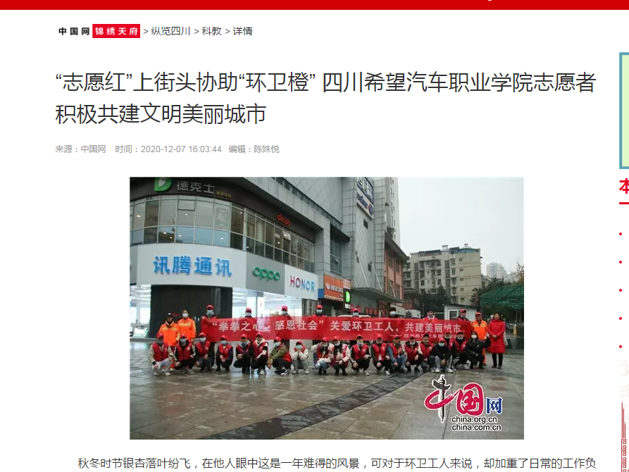 中国网锦绣天府 | “志愿红”上街头协助“环卫橙” 四川希望汽车职业学院志愿者积极共建文明美丽城市