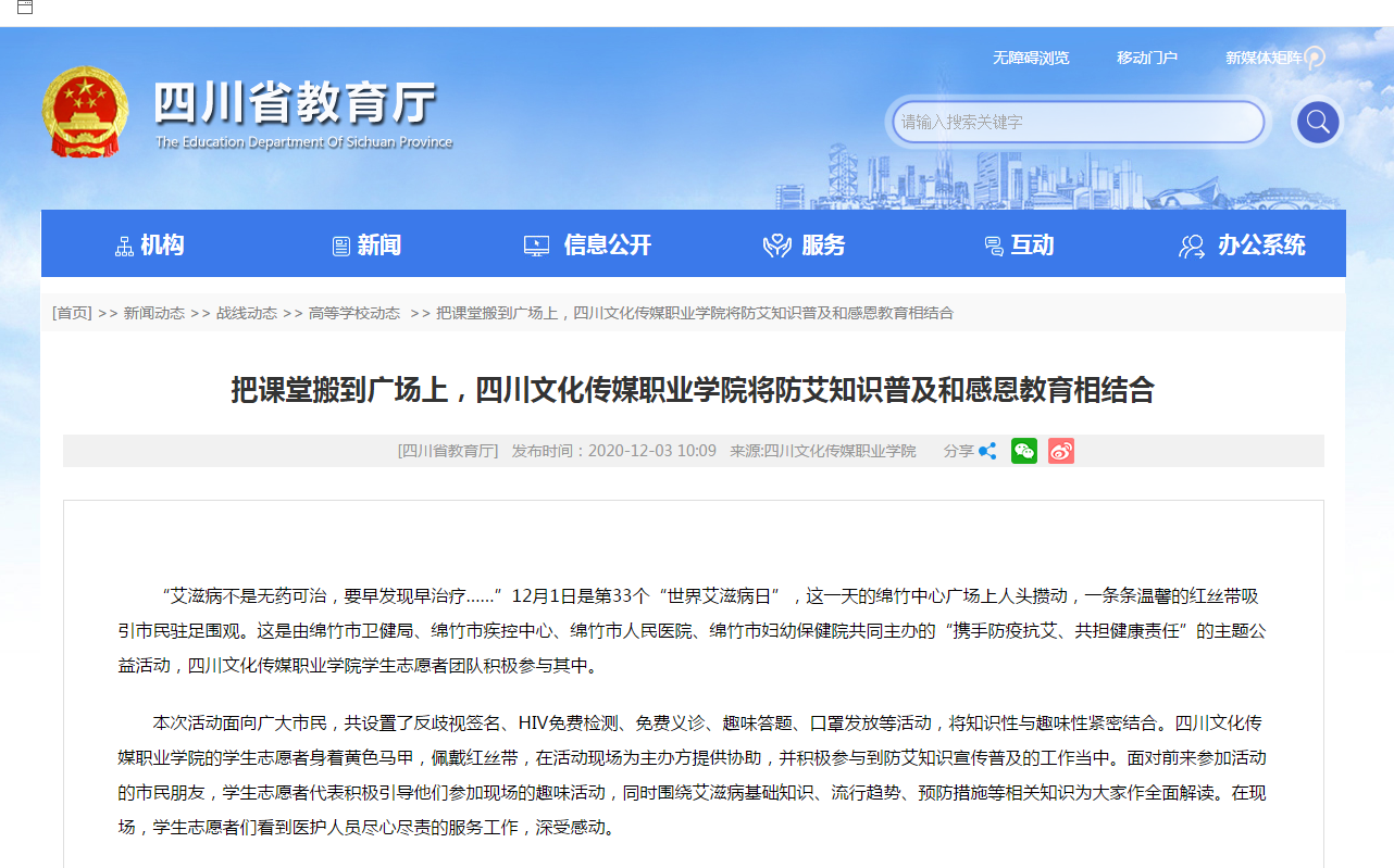 四川省教育厅 | 把课堂搬到广场上,四川文化传媒职业学院将防艾知识普及和感恩教育相结合