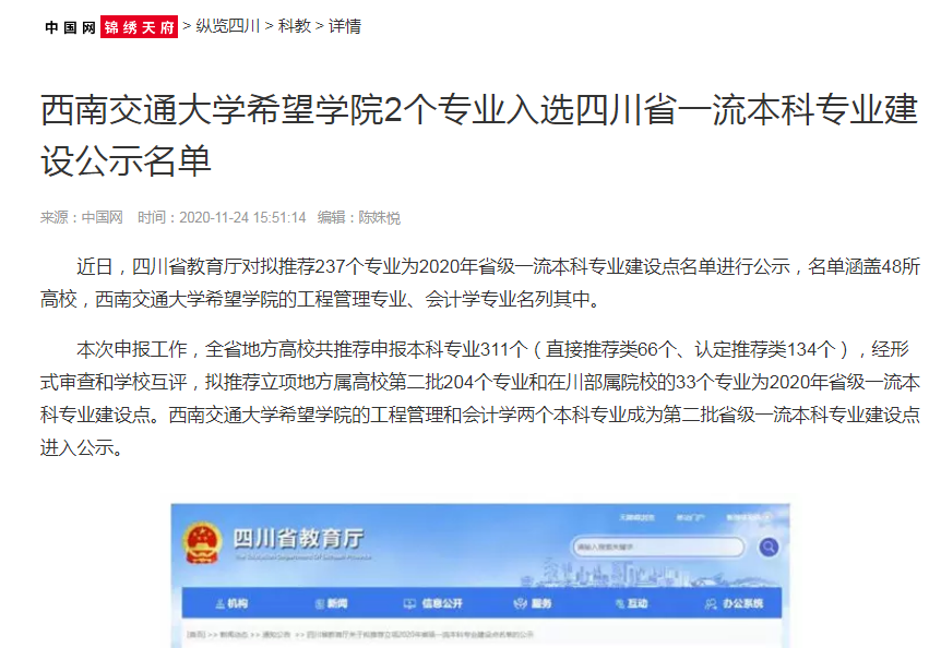 中国网锦绣天府 | 西南交通大学希望学院2个专业入选四川省一流本科专业建设公示名单