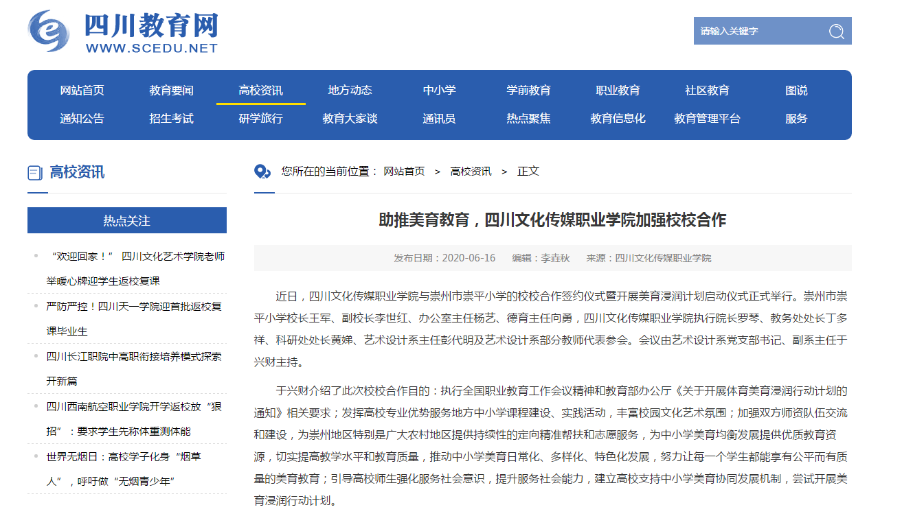 四川教育网 | 助推美育教育,四川文化传媒职业学院加强校校合作
