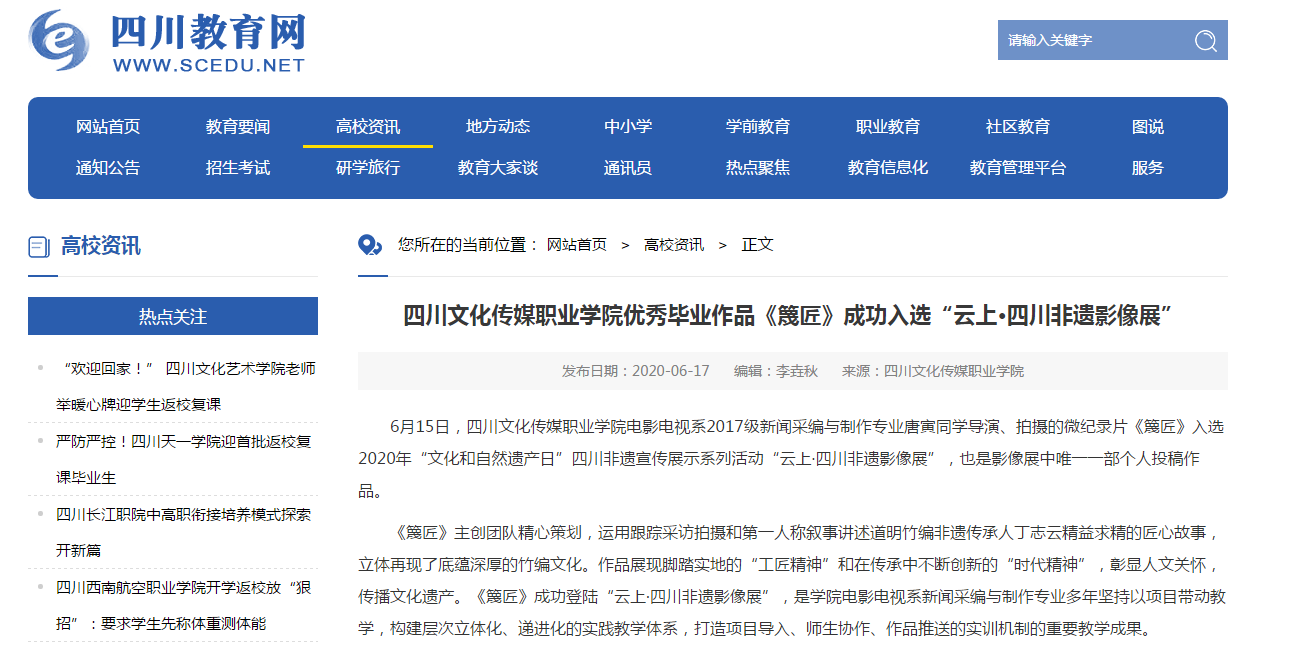 四川教育网 | 四川文化传媒职业学院优秀毕业作品《篾匠》成功入选“云上·四川非遗影像展”