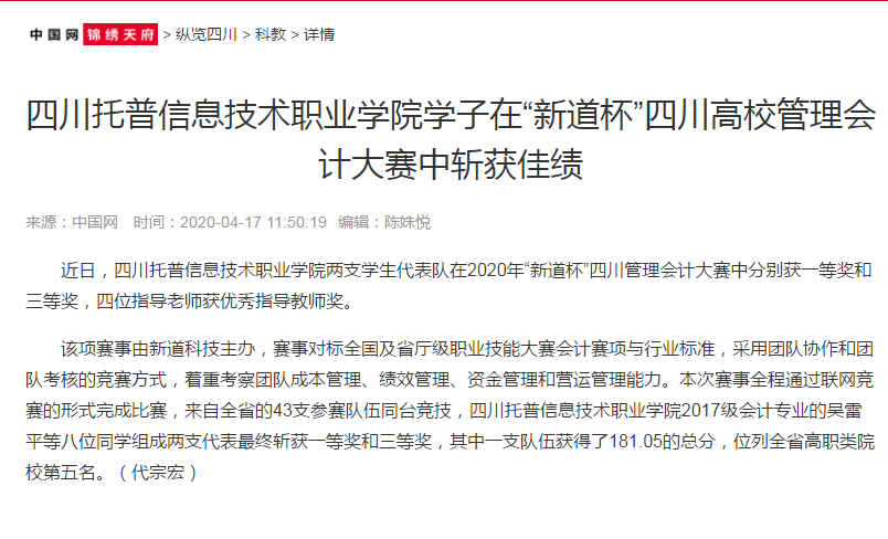 中国网锦绣天府 | 四川托普信息技术职业学院学子在“新道杯”四川高校管理会计大赛中斩获佳绩