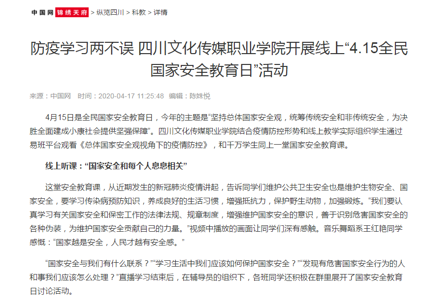 中国网锦绣天府 | 四川文化传媒职业学院开展线上“4.15全民国家安全教育日”活动