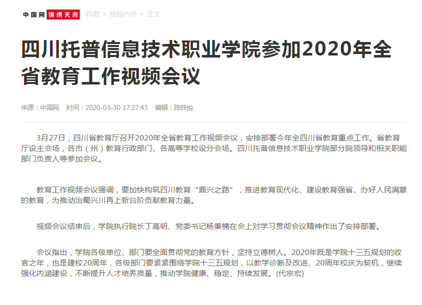 中国网锦绣天府 | 四川托普信息技术职业学院参加2020年全省教育工作视频会议