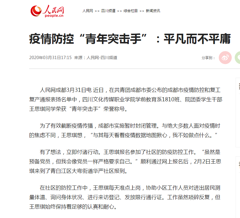 人民网四川频道 | 疫情防控“青年突击手”:平凡而不平庸 | 四川文化传媒职业学院
