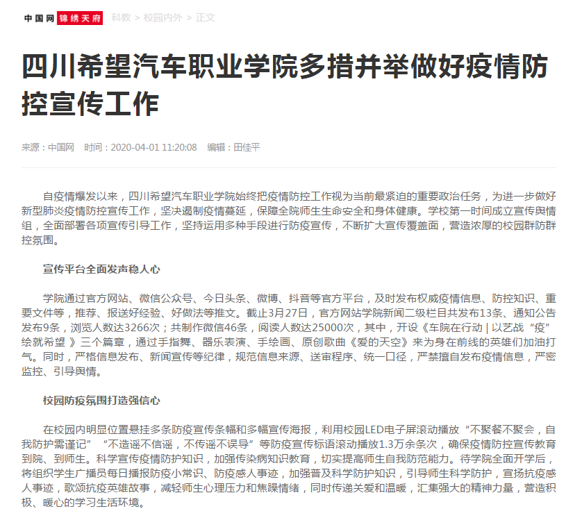 中国网锦绣天府 | 四川希望汽车职业学院多措并举做好疫情防控宣传工作