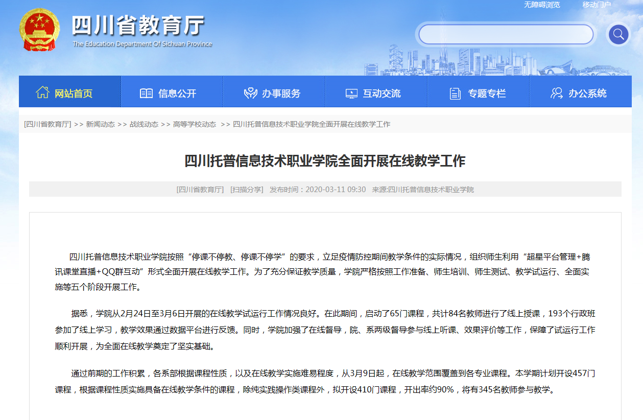 四川省教育厅 | 四川托普信息技术职业学院全面开展在线教学工作