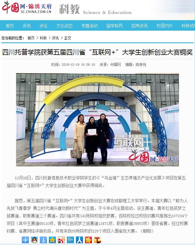 中国网锦绣天府 | 四川托普学院获第五届四川省“互联网+”大学生创新创业大赛铜奖