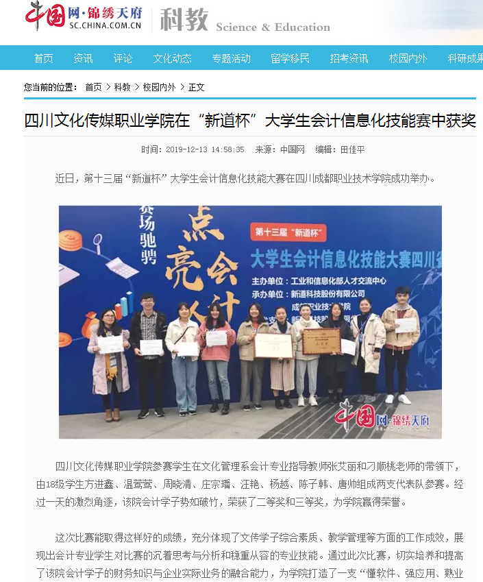 中国网锦绣天府 | 四川文化传媒职业学院在“新道杯”大学生会计信息化技能赛中获奖