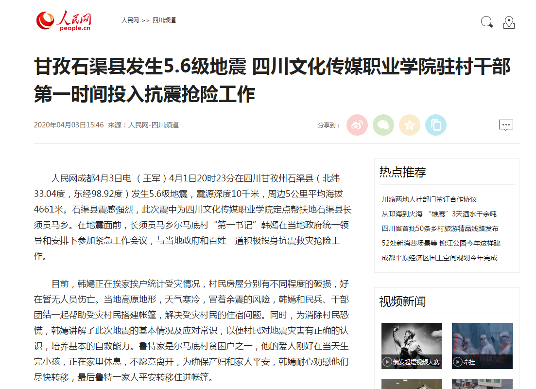 人民网四川频道 | 甘孜石渠县发生5.6级地震 四川文化传媒职业学院驻村干部第一时间投入抗震抢险工作