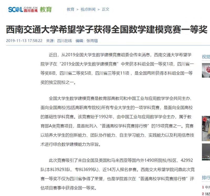 四川在线 | 西南交通大学希望学子获得全国数学建模竞赛一等奖